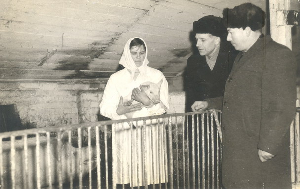 Purplių fermoje: Ona Šakienė, kolūkio pirmininkas Juozas Venalis ir zootechnikas Raibys