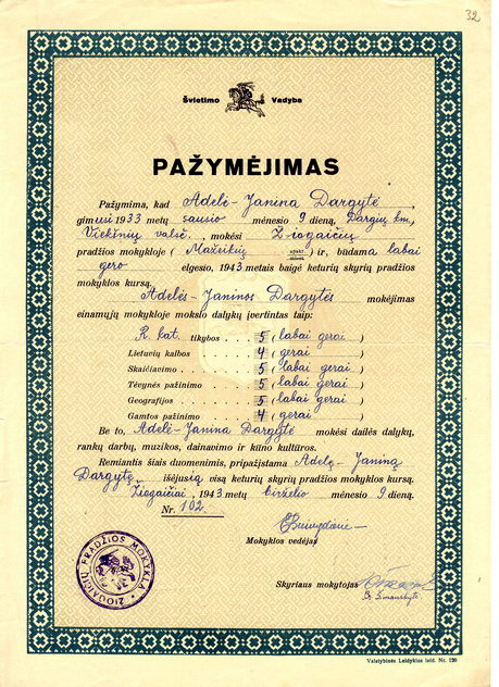 Mažeikių muziejus: Mažeikių gimnazijos archyvas, pažymėjimai D, l. 32.